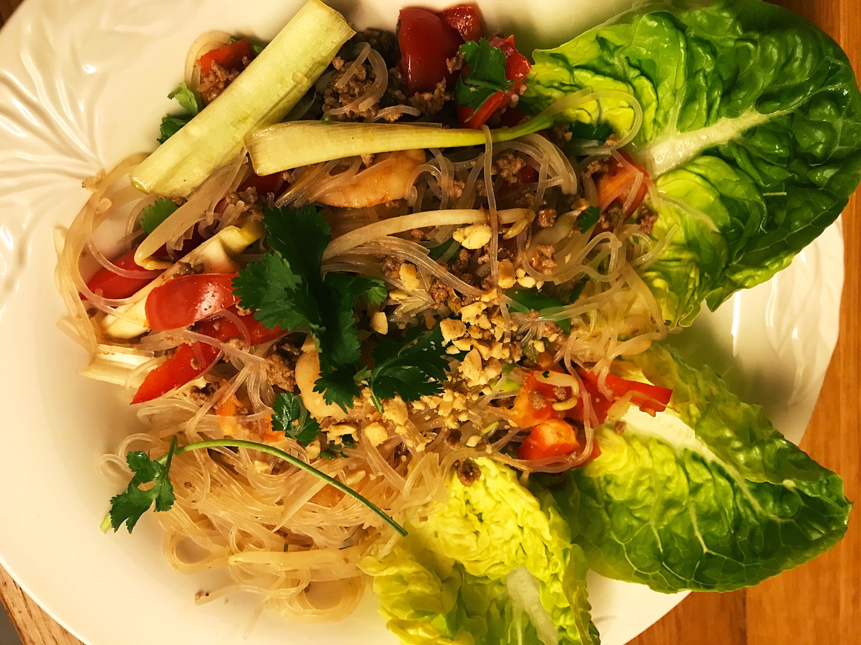 Salat mit Glasnudeln, Garnelen, Hackfleisch und Gemüse