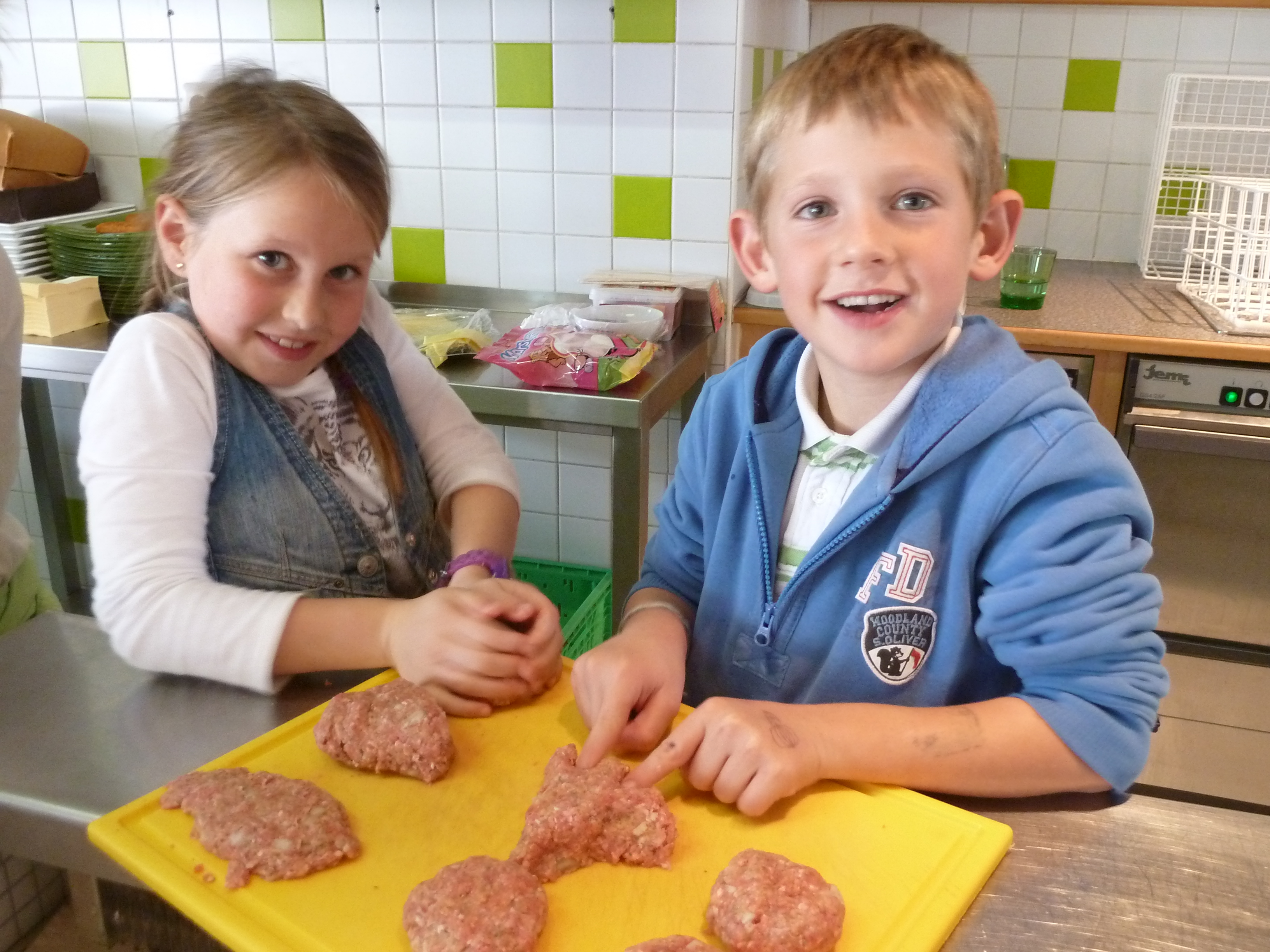 Kinder bereiten faschierte Laibchen für lustige Burger zu.