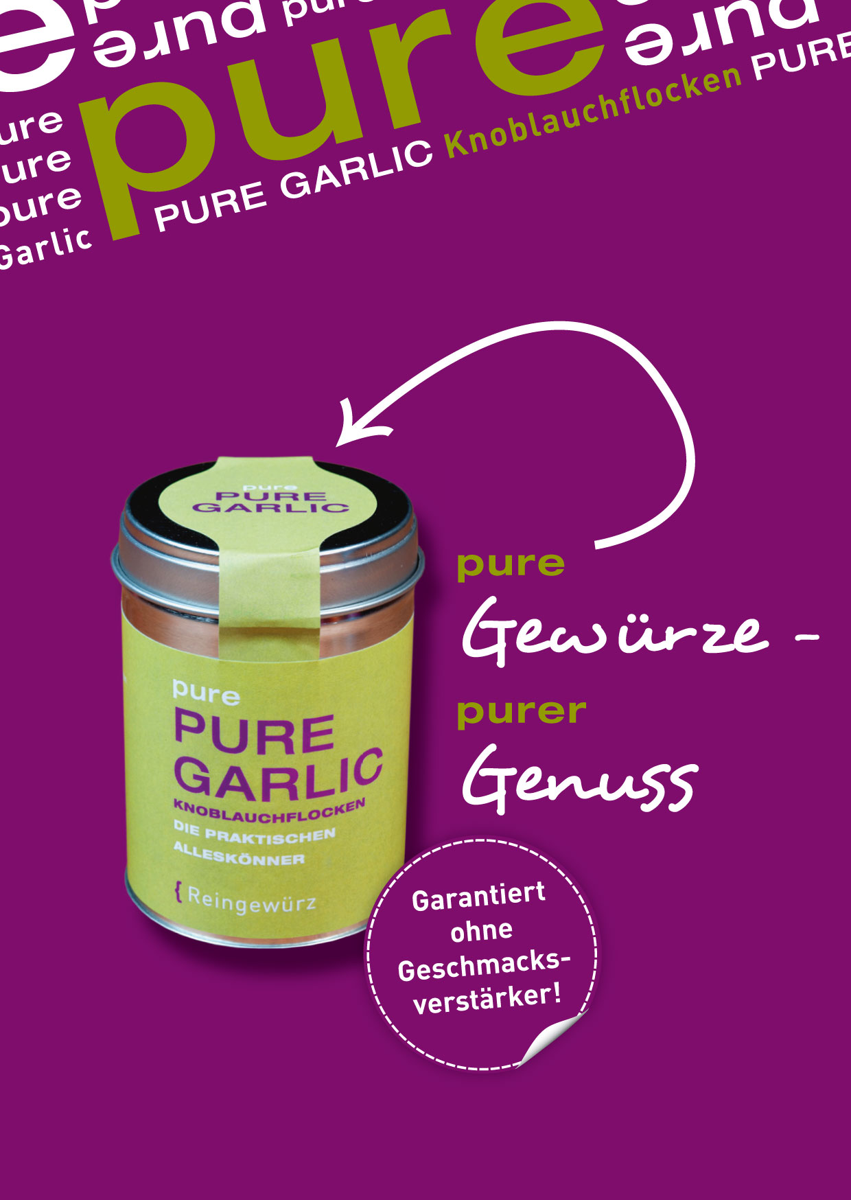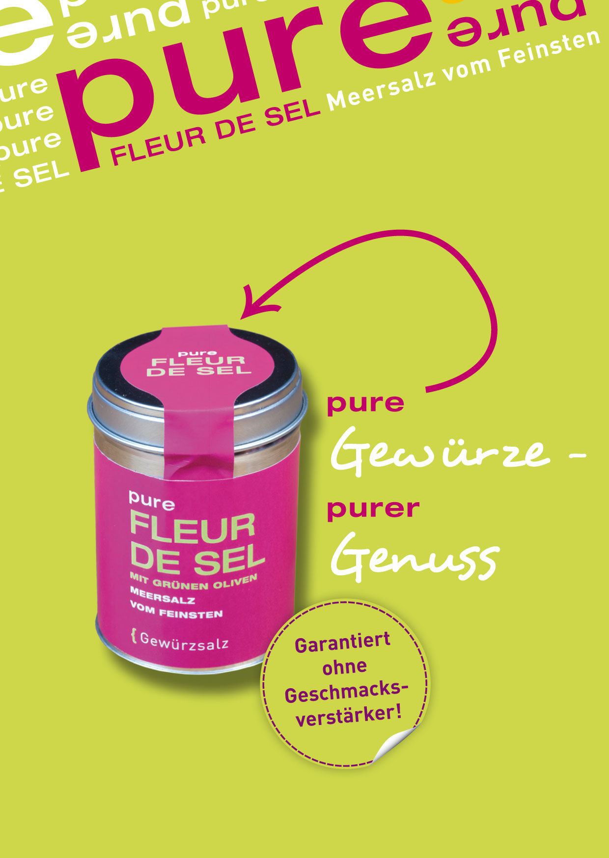Mit den neuen pure Gewürzen bringen sie puren Schwung in Ihre Küche. Die Gewürzmischungen sind garantiert auf rein natürlicher Basis ohne Konservierungsmittel und Emulgatoren. Sie passen zu Fisch, Fleisch & Gemüse.