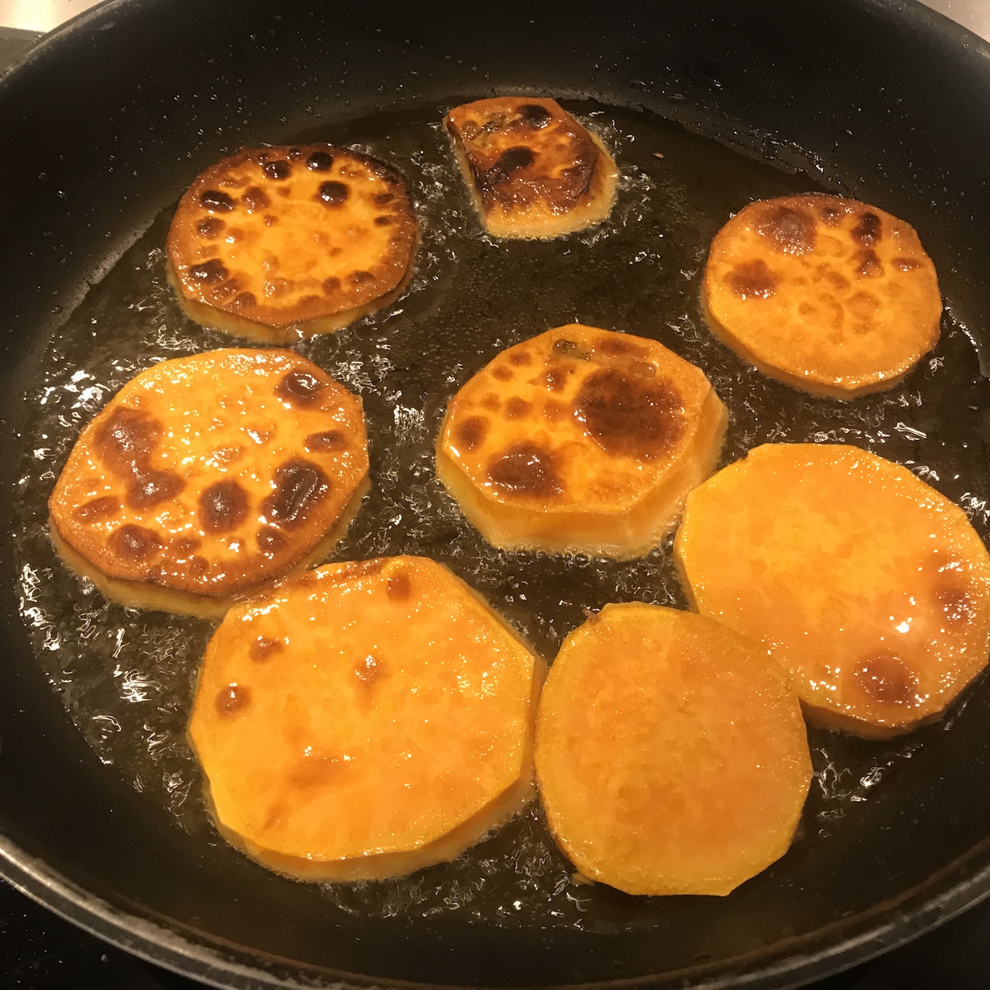 Süßkartoffeln in 1 cm dicke Scheiben schneiden und anbraten.